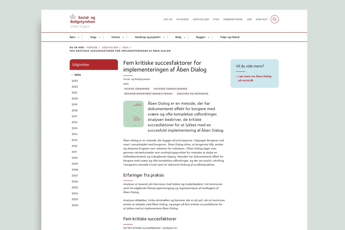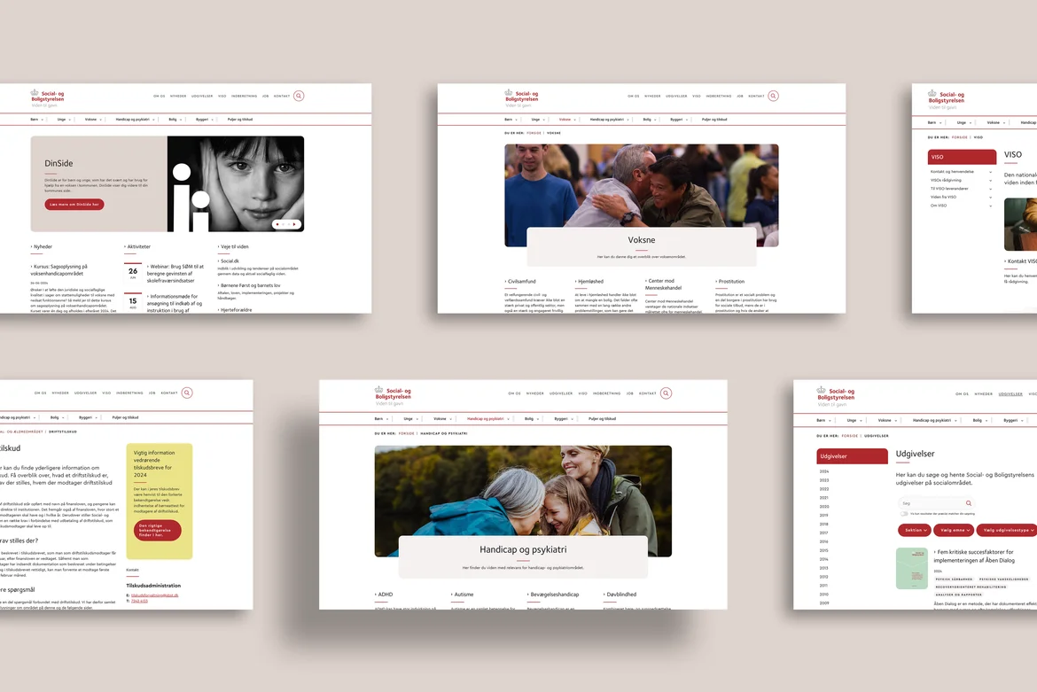 Social- og Boligstyrelsen ønskede at skabe en fælles visuel ramme for koncernens digitale løsninger og samle deres portefølje af websites på én fælles platform. Der var bl.a. sat tid af til at skabe koncept og indholdformater til et helt nyt site til videnformidling på det sociale område. En væsentlig indsats blev lagt i at få migreret og finpudset de 4600 indholdssider på hovedsitet, så de nu står knivskarpt på de nye sites.